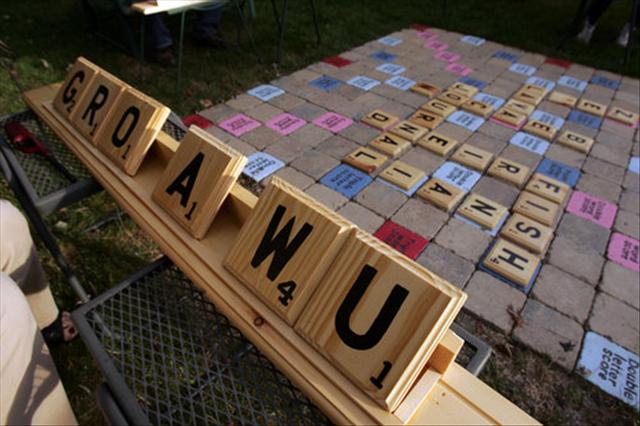 Keith Crane and his wife Jane built this large scrabble game in their back yard on Wednesday, Sept. 24, 2008 in North Canton, Ohio. The scrabble game is made from paving stones. (Ken Love/Akron Beacon Journal)